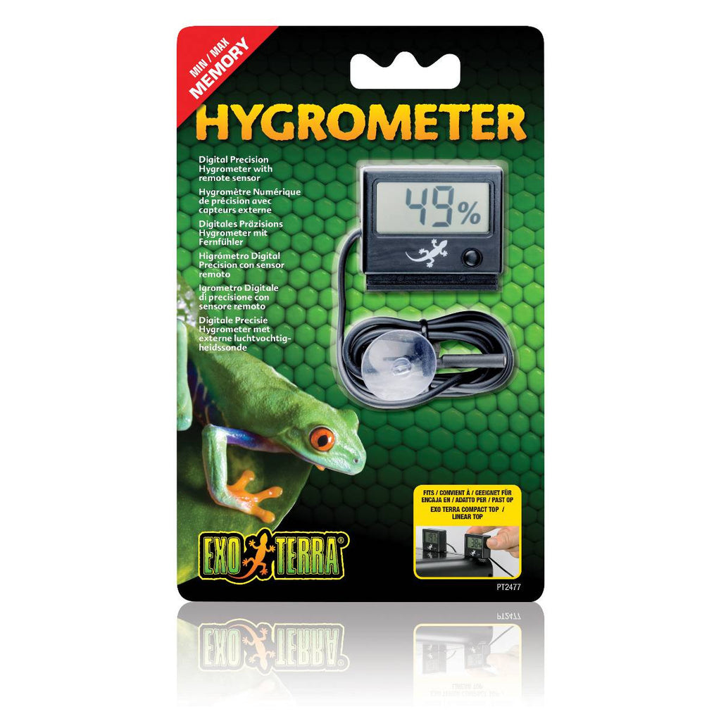 The Exo Terra Digital Hygrometer measures humidity in your pet reptile or amphibian's enclosure with a handy remote wired probe. It also records the minimum and maximum humidity levels it has read.