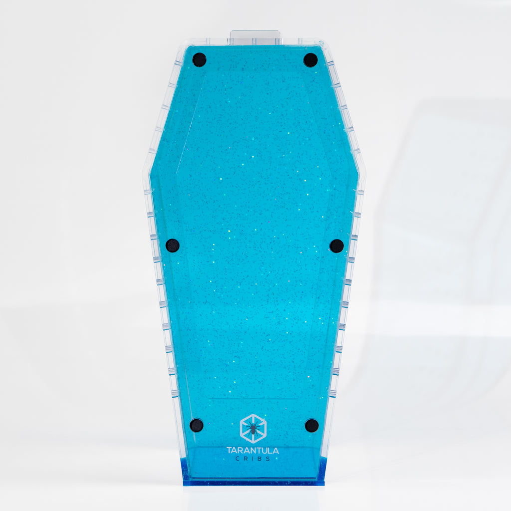Glitter Crib Coffin Medium – Glitter Blue Dimensions: 10” x 5” x 5” Ventilation: 2 mm ventilation holes Material: Premium acrylic Color: Glitter Blue