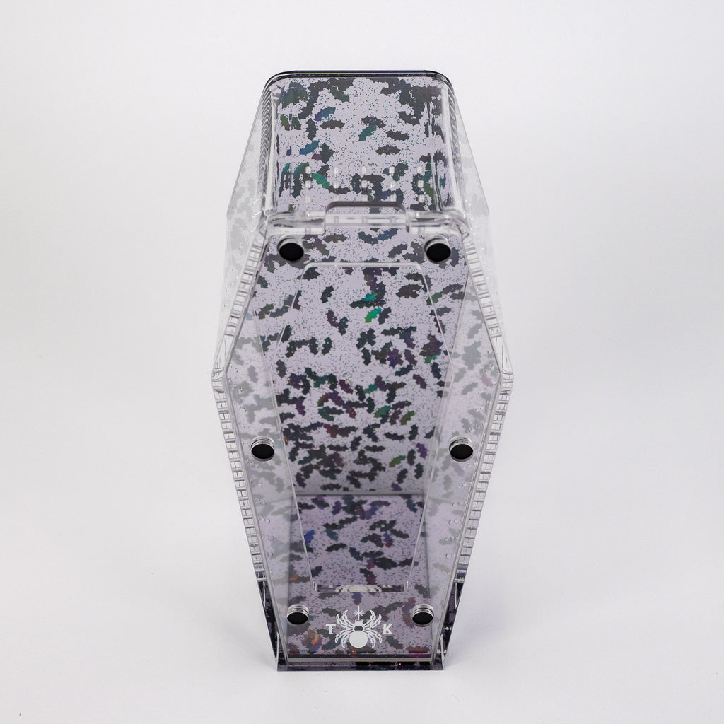 🦇 Limited-Edition Design Crafted in a brand-new medium-small size (8"x4"x4"), this coffin crib bridges the gap between our mini and medium enclosures. It’s the perfect in-between for those who want something unique, functional, and mesmerizing. Embedded in the stunning bat glitter acrylic are shiny black bats that shimmer in the light, creating an eerie yet captivating look.