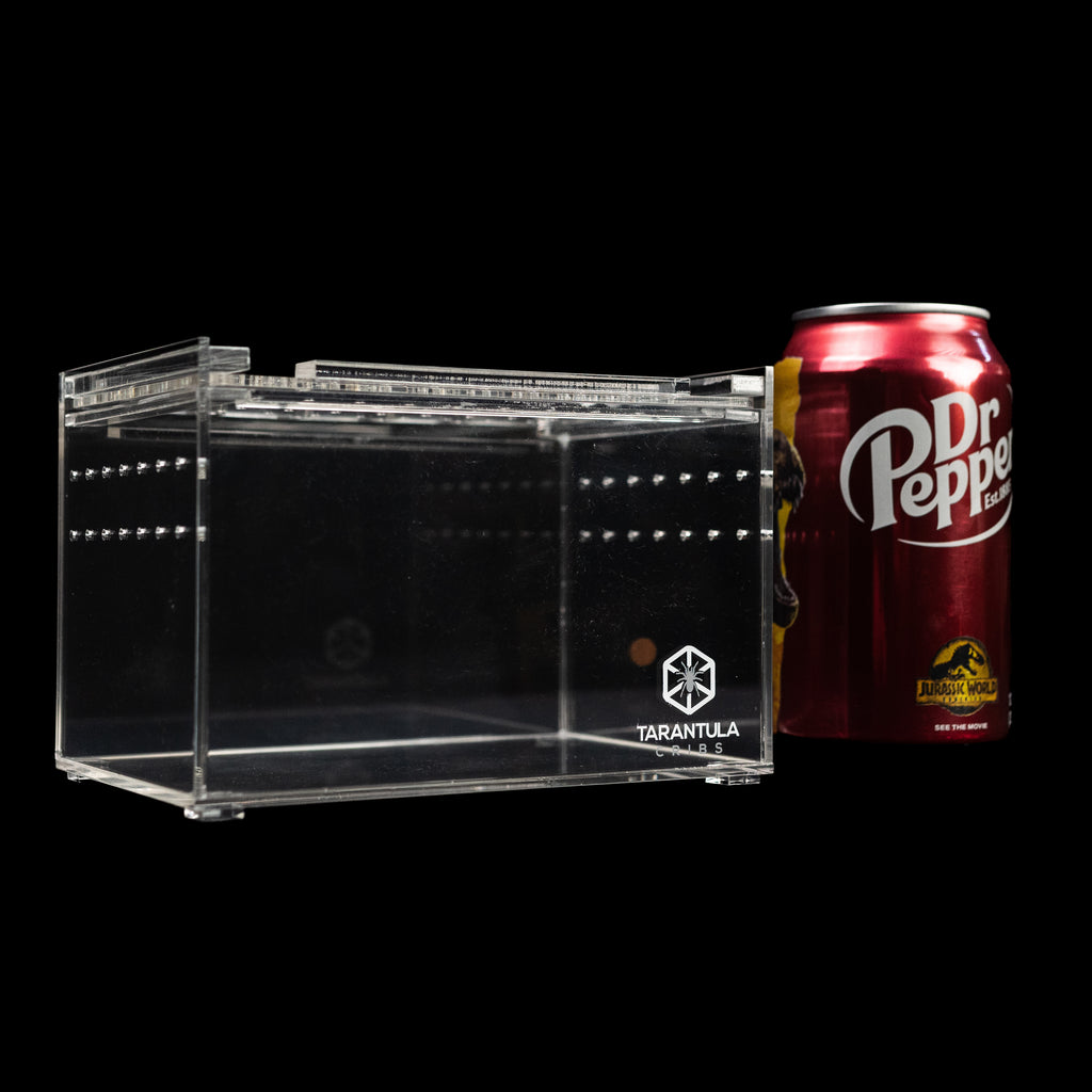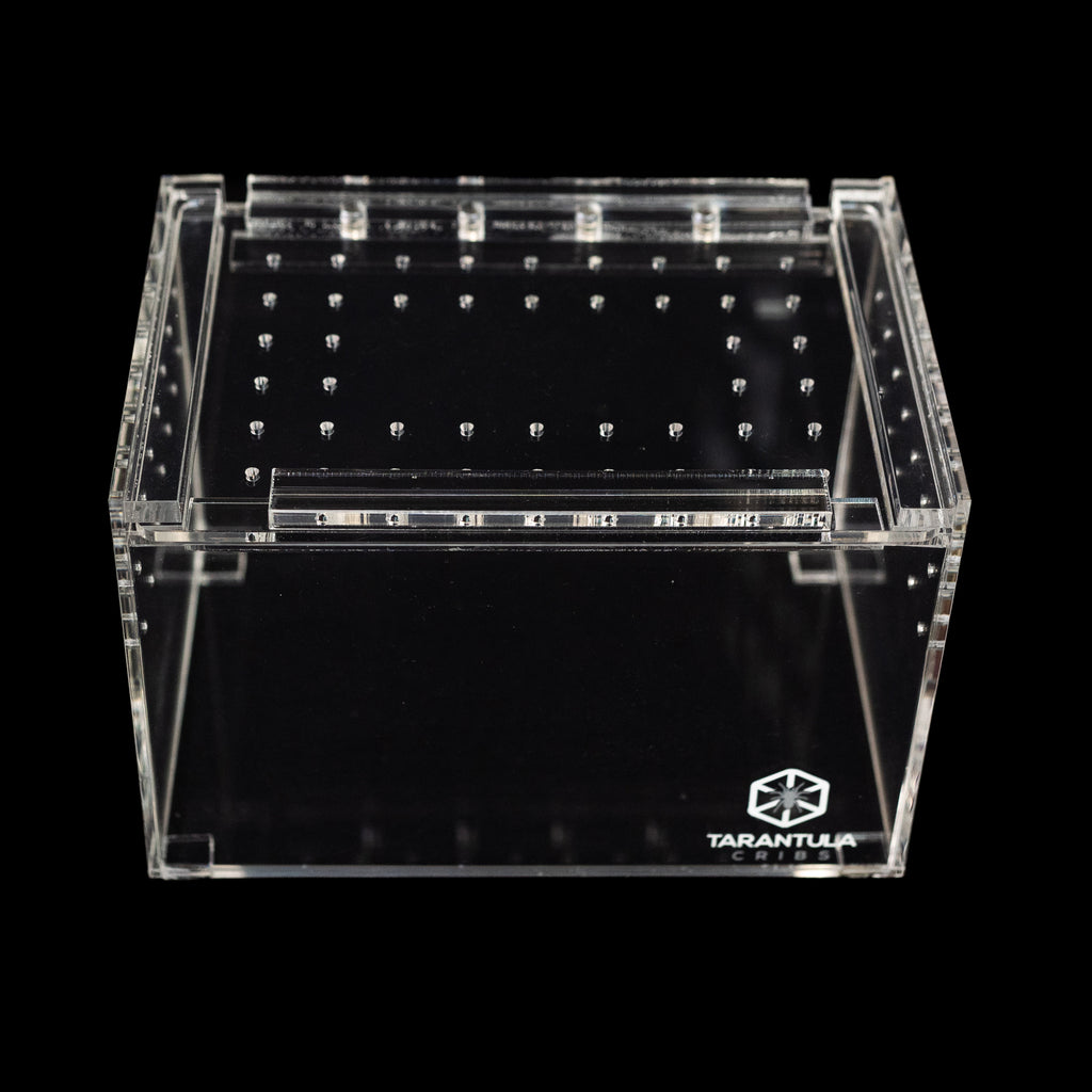 The Small Slider Crib is a sleek and functional enclosure designed for spiderlings, juveniles, or dwarf tarantulas. This compact and stackable design makes it perfect for keepers with multiple enclosures.