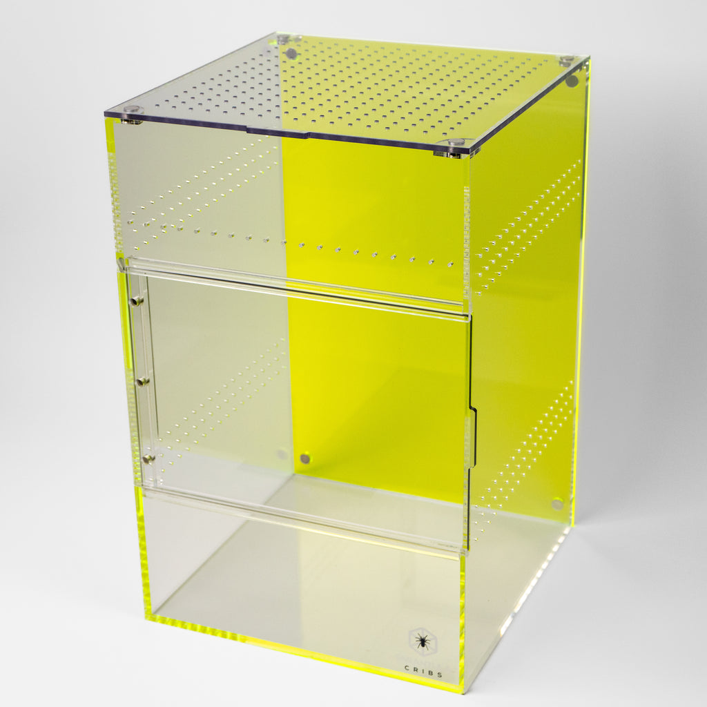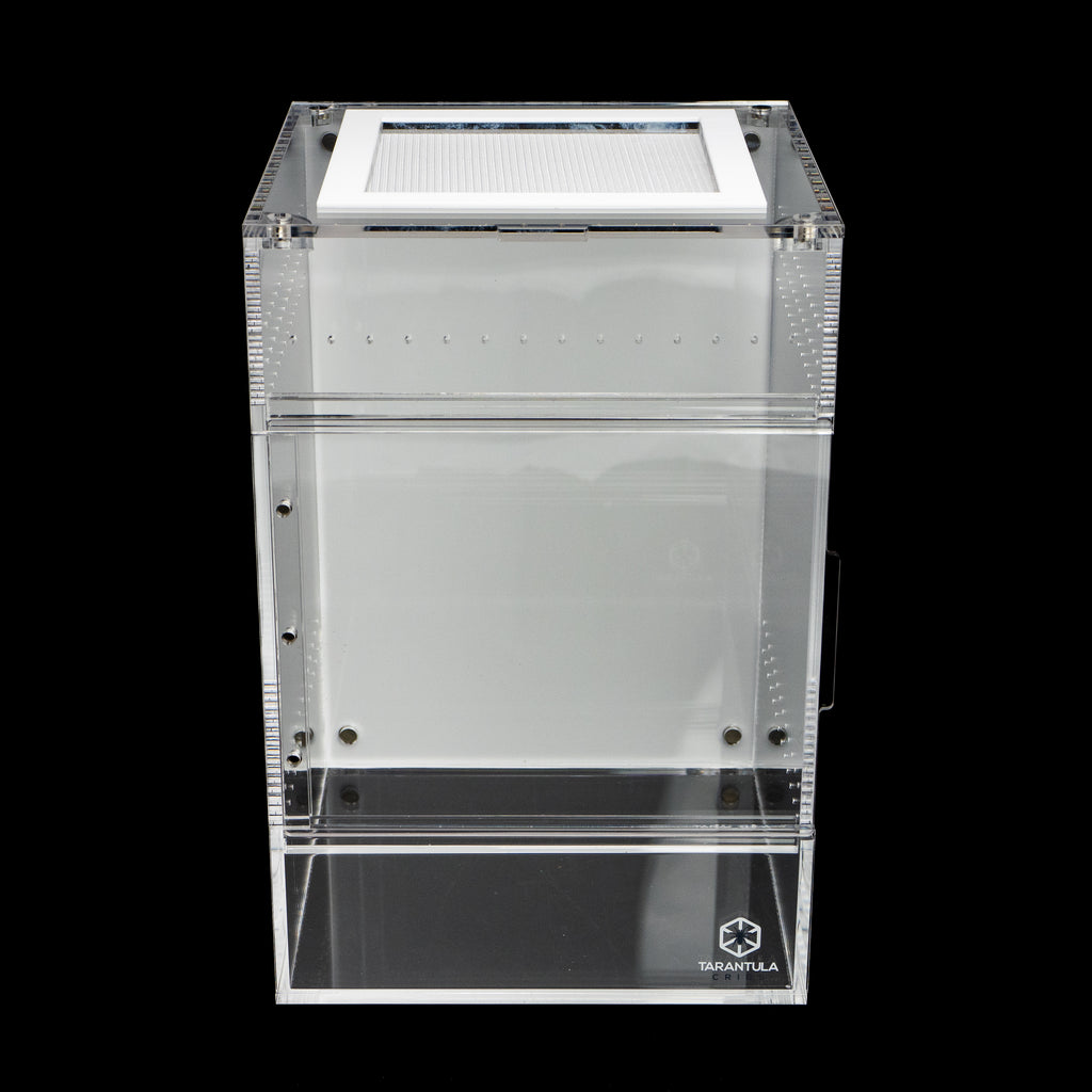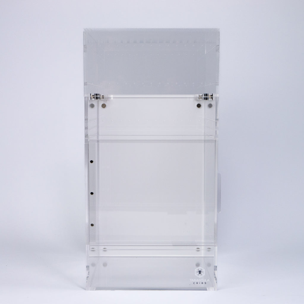The Treehouse SWITCH (Large) enclosure is designed for maximum versatility and modularity. Measuring 8"x8"x12", this patent-pending design from Tarantula Cribs offers a front-opening sliding door, sealed with magnets for secure and smooth operation. This enclosure is perfect for housing larger tarantulas, spiders, and other exotic pets, providing a highly customizable habitat with multiple lid and background options.
