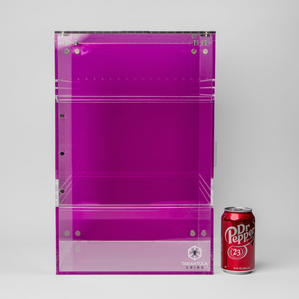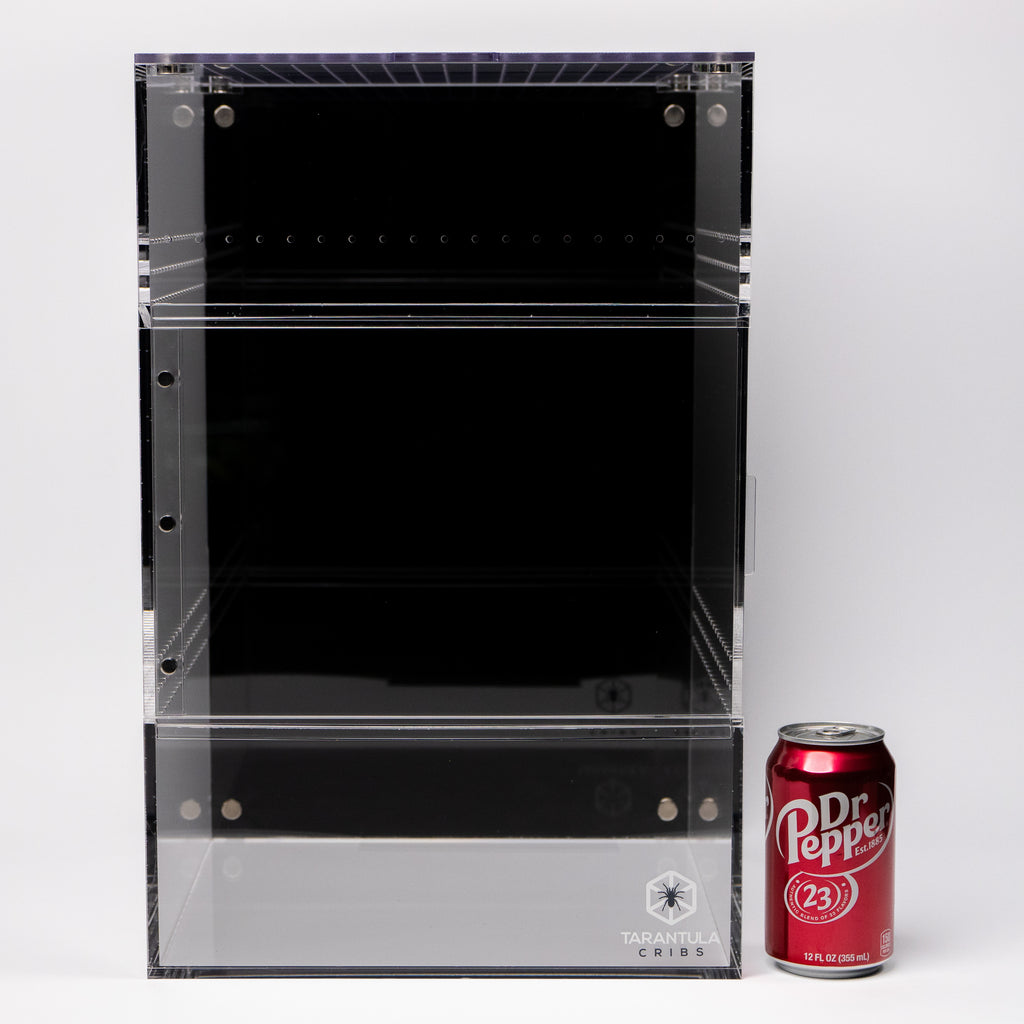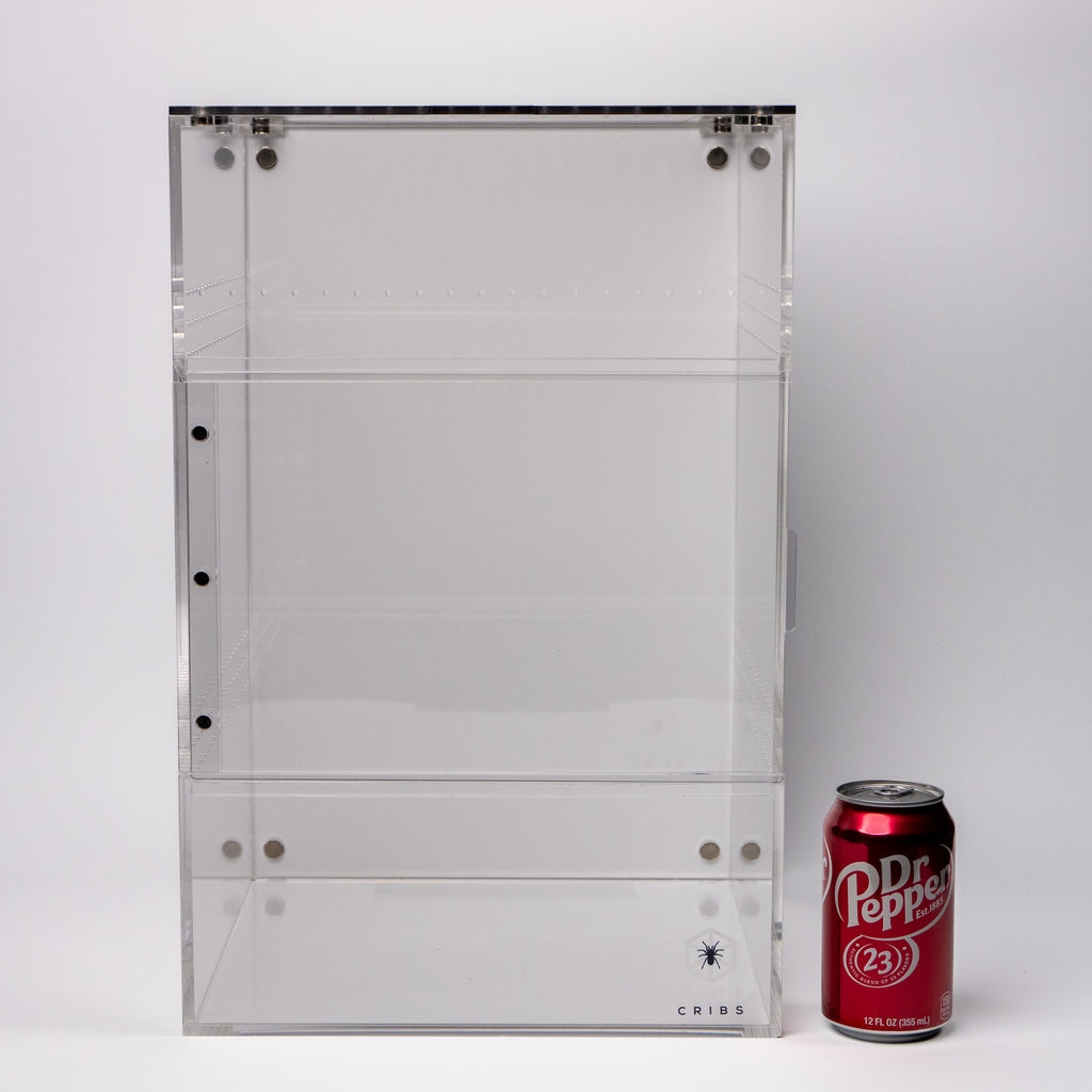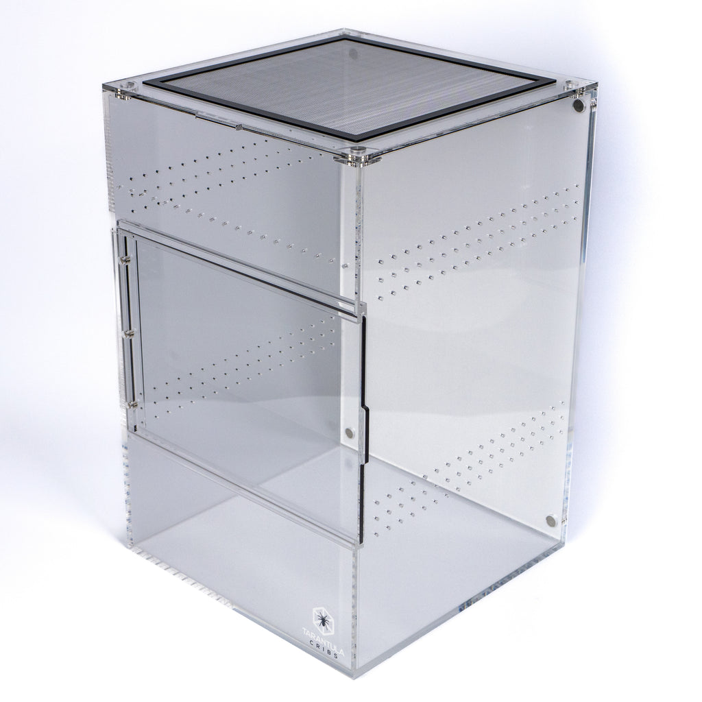 The Treehouse XL SWITCH is a colossal enclosure designed for large terrestrial or arboreal species. Measuring 12"x12"x18", this patent-pending design from Tarantula Cribs offers unmatched modularity and customization. It is perfect for housing large tarantulas, mourning geckos, and other exotic pets requiring ample space and varied ventilation options. The front-opening sliding door, sealed with magnets, ensures ease of access while maintaining the integrity of the habitat.