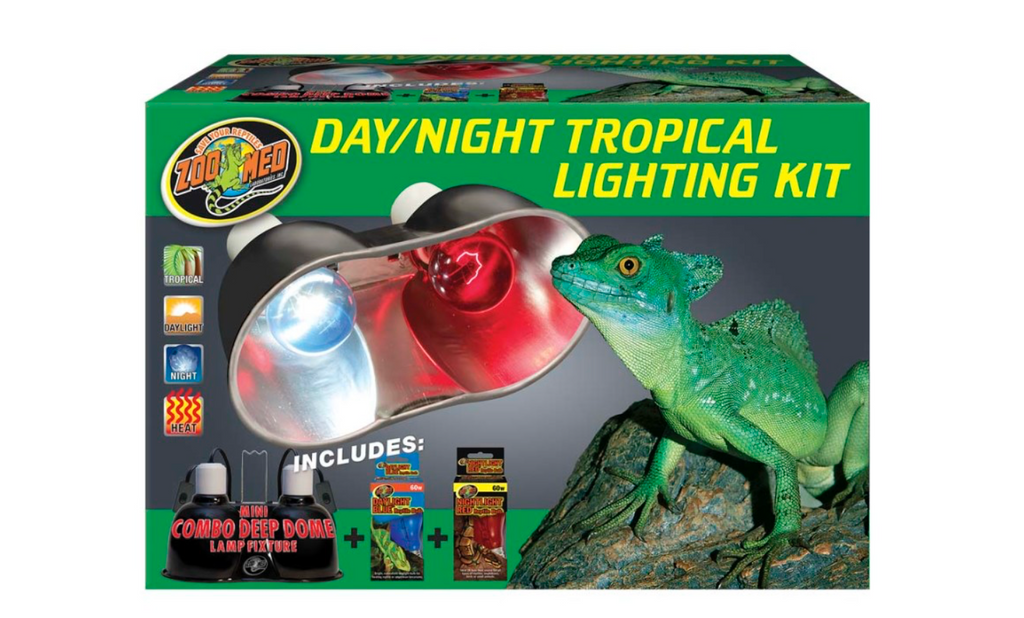 Zoo Med's Day/Night Tropical Lighting Kit Includes: Mini Combo Deep Dome: Dual ceramic sockets for use with lamps up to 160 watts (each socket). Dual on/off switches for greater convenience. Daylight Blue Reptile Bulb 60 watt: Bright, naturalistic daylight bulb for heating reptile or amphibian terrariums. True blue glass (not painted or coated) for better heat transfer made of European quality for long burn life. Nightlight Red Reptile Bulb 60 watt: Perfect Nightlight heating bulb for viewing the nocturnal behavior of your animals. Very little visible light provided so as not to disturb your animal's sleeping patterns. True red glass (not painted or coated) for better heat transfer made of European quality for a long burn life.